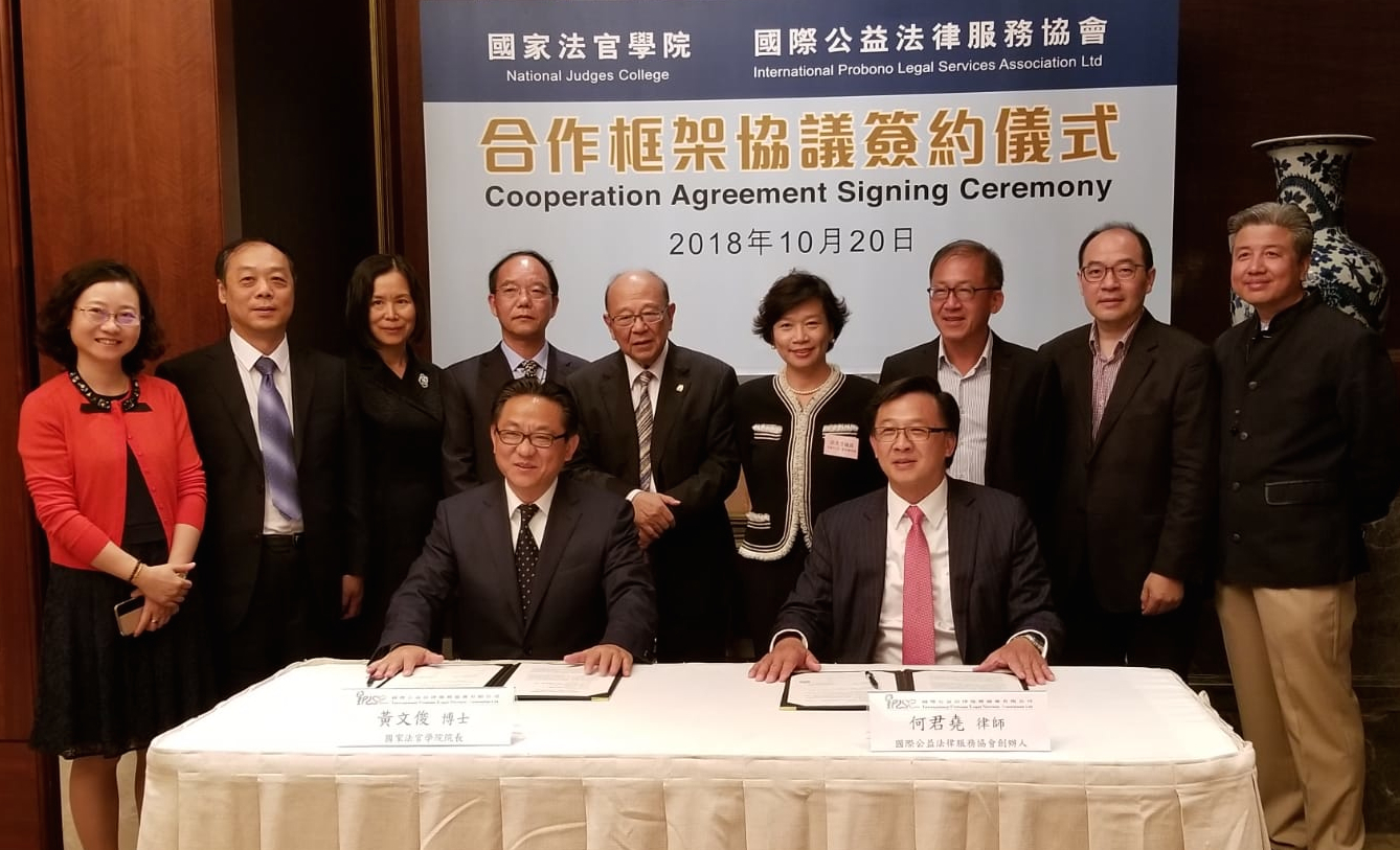 On October 20, 2018, the National Judges College and the International Probono Legal Services Association (IPLSA) signed a cooperation framework agreement in Hong Kong to organize training courses for Hong Kong lawyers to enhance their understanding of the national judicial system. Dr. Huang Wenjun, Dean of the National Judges College and Mr. Junius Ho, the founder of IPLSA, signed the cooperation agreement on behalf of both parties. Senior Consultants of IPLSA, Dr. Priscilla Leung and Dr. David Lan, and members of the IPLSA Board of Directors also attended the signing ceremony.