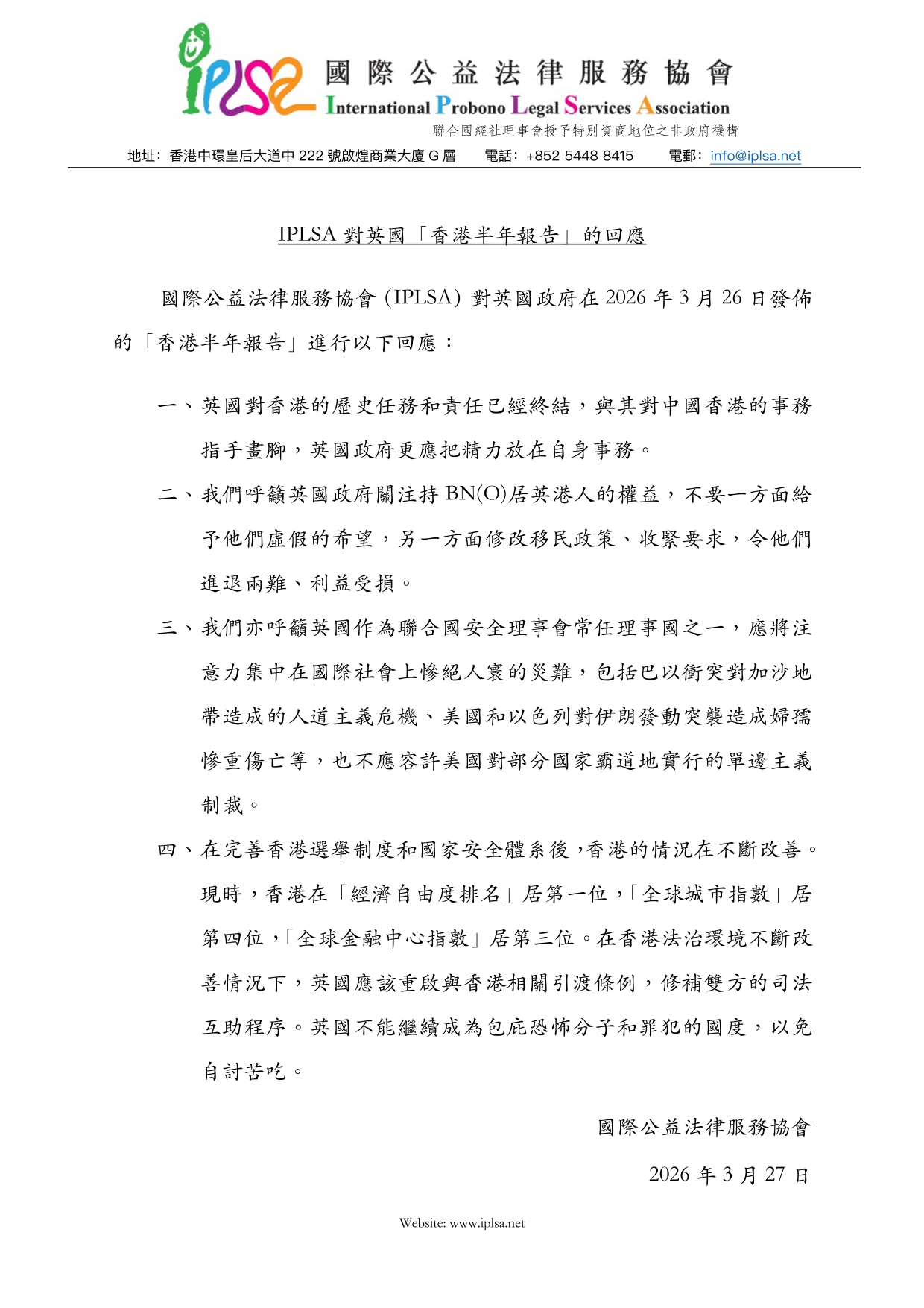 IPLSA Response to the UK Government’s “Six-monthly Report on Hong Kong”